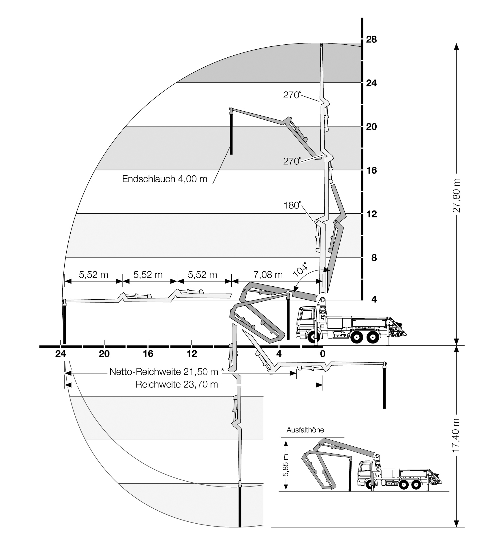 Diese Universalmaschine S 28 X demonstriert ihre Überlegenheit dank der besonderen Verteilermast-Kinematik besonders bei Betonagen unter engen Platzverhältnissen.